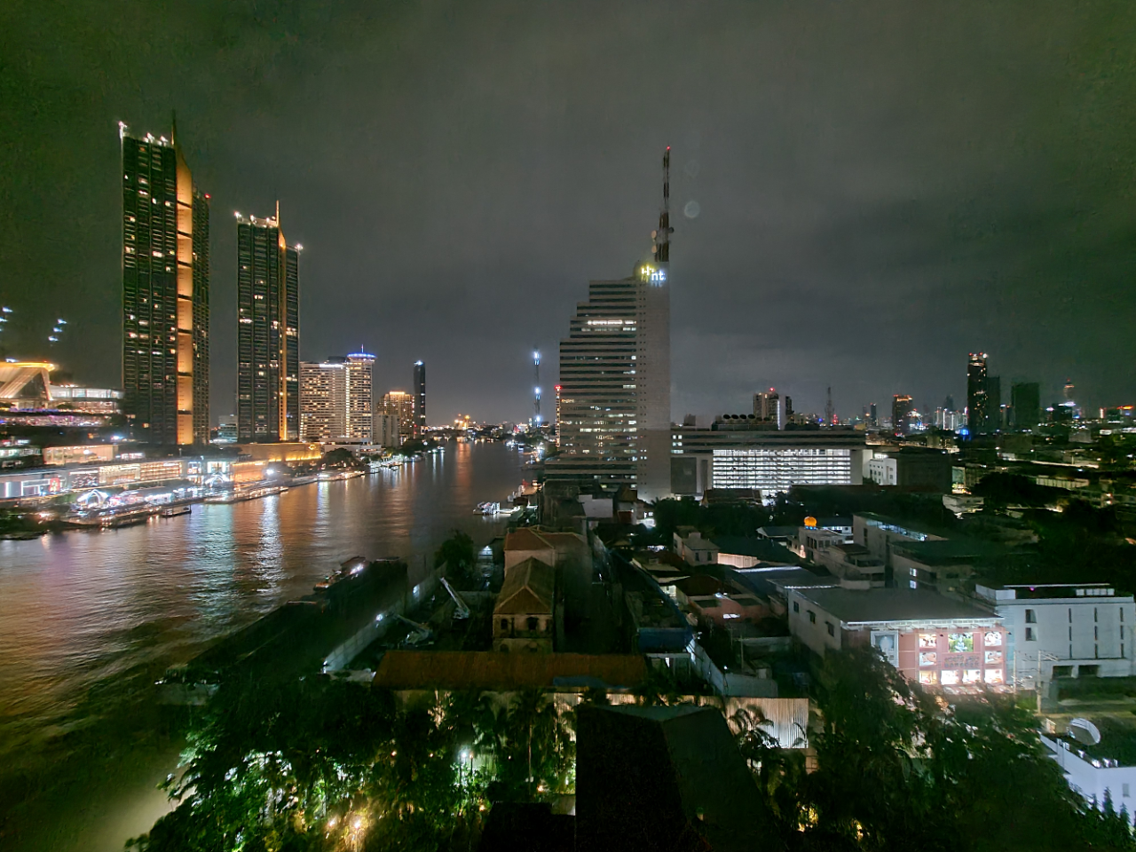 Von meinem Zimmer aus blickte ich direkt auf das geschäftige Treiben am Fluss – Boote, Fähren, Händler – das lebendige Herz Bangkoks direkt vor meinem Fenster.